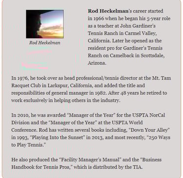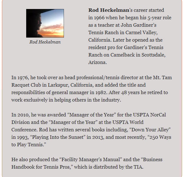 I had the pleasure of reviewing Rod Heckelman’s book Playing Into The Sunset a short while ago. Rod is a very experienced Tennis Director and teacher, author, and a regular writer for Racket Business and its predecessor Tennis Club Business since 2015.